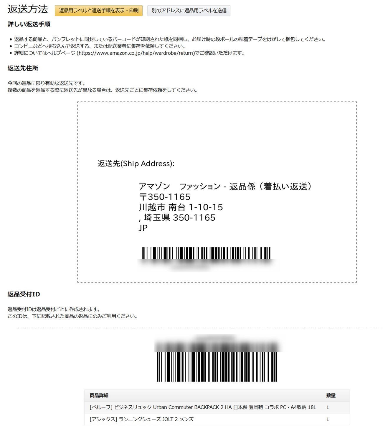 返品用の伝票は、送られてきた時に同封されていたものを使用する方がいいのですが、無くしてしまったり、お住いの地域で使えない場合は、Amazonの注文履歴から返品用のラベルを印刷して、別の宅配業者に依頼することもできます。