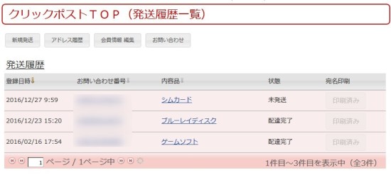 また、発送側の人については、クリックポストのサイトにログインすることで、これまでの発送記録及び荷物の問い合わせ番号(追跡用番号)が分かるようになっているのでとても便利です。