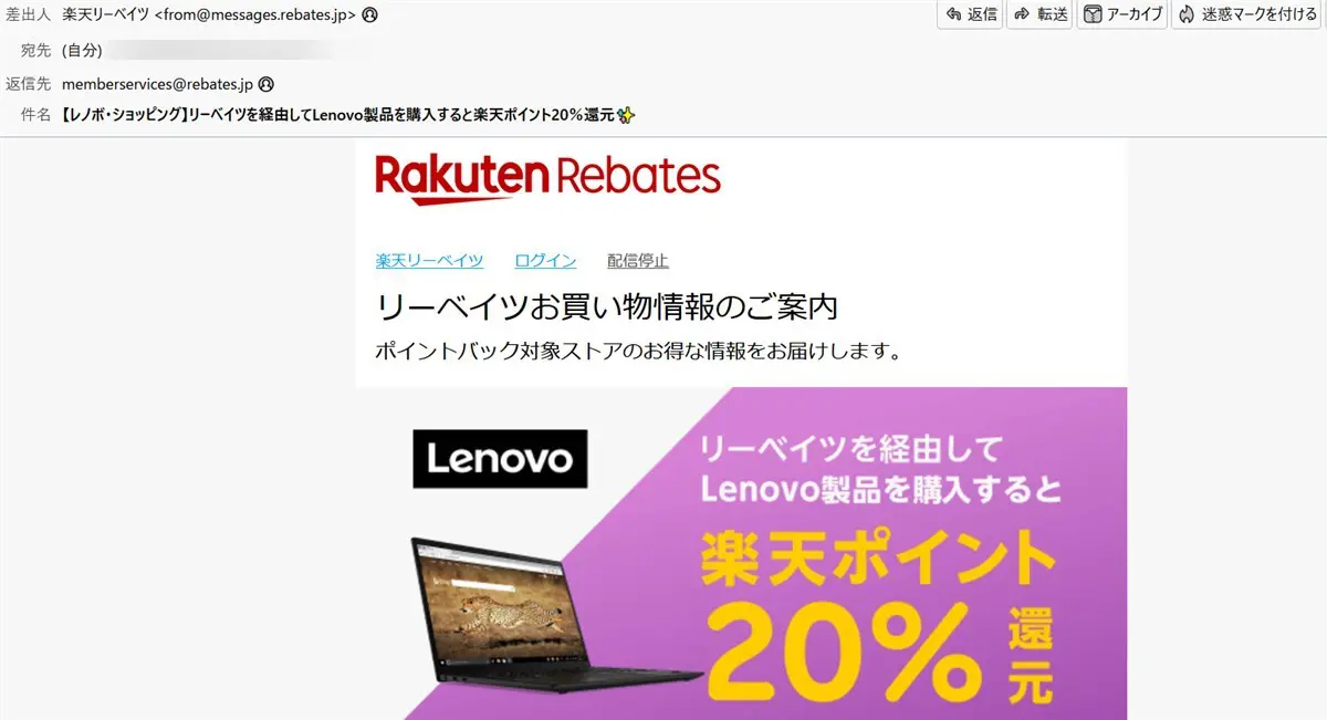 楽天Rebates(リーベイツ)経由でレノボのサイトにアクセスしてPCを購入すると、楽天ポイントが購入金額の20%も還元されます。